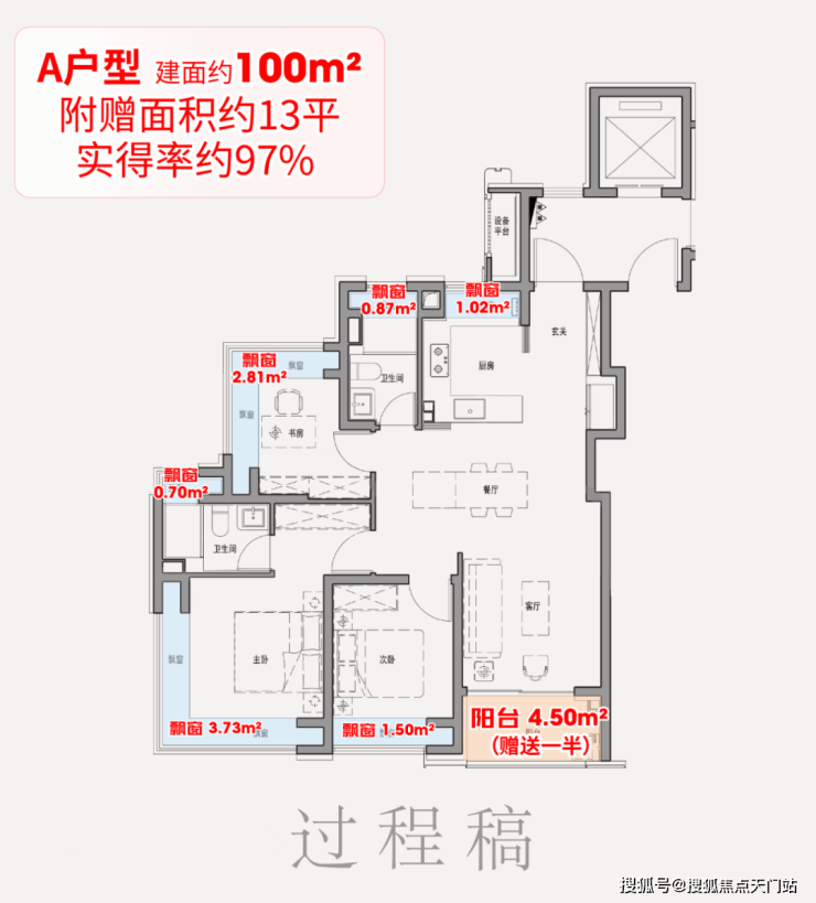 该户型满配6飘窗,比常规户型多2个卫生间飘窗、1个厨房飘窗;再加上阳台送一半面积,经过测算总赠送约9.3平,相当于一间次卧。