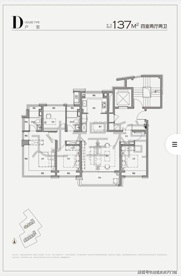 建面约137㎡的4房户型,在同等面积下实现了更精巧的功能布局,标配入户玄关,客餐厅、厨房、阳台一线贯通,家政间,通透感十足270°全景舱设计是项目一大亮点,部分户型通过北/南/西三向展开近36米连续玻璃幕墙,西南向无遮挡,城市与公园景一览无余