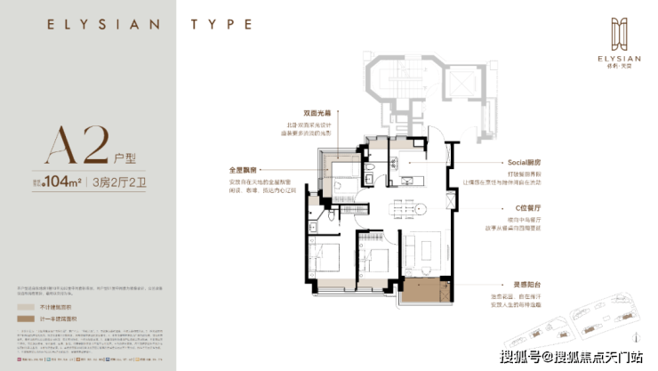 保利天奕的百平三房做了两个,分别是 建面约106㎡边套户型和建面约104㎡中间套户型,总价低至7字头。