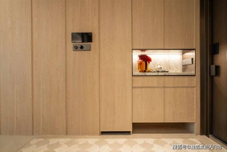 值得一提的是,整个玄关柜是天然木皮鸡翅木包裹,用料昂贵。并且与墙面、地板几乎一个色系,营造一气呵成的视觉观感,传递出一种低调内敛的豪华感。