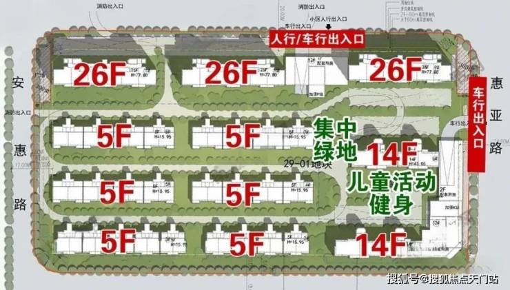 29-01地块原设计方案,将北面人行/车行的出入口向西侧的安惠路方向进行了调整,并疑似将北面的主入口调整到了惠亚路一侧。