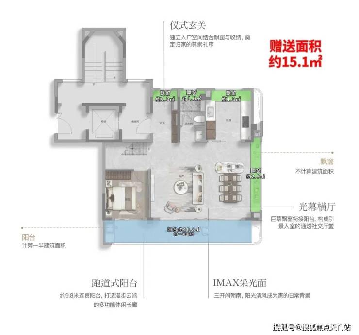 这个户型有约9.8㎡的飘窗,约7.2㎡的阳台,整体的附赠高达约13.4㎡。 这是目前上海外环沿线,是附赠率最高的一个小高层产品。