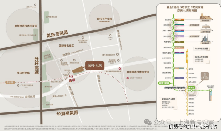 交通方面,该地块算是唐镇地铁上盖项目,与2号线唐镇站直线距离约200米,南侧紧贴着高科东路。通过2号线,2站金科路站,3站张江高科站,9站陆家嘴。