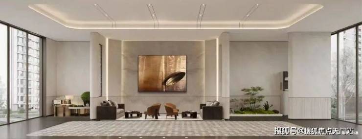 同时,入户大堂立面造型延续了主立面的框与线结合,飘顶弧形雨棚,组成高定入户大堂,增加入户仪式感。