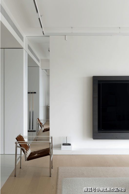 书柜和灰色涂料的立面处理形成了空间的视觉延续性,打破了传统界面的固有局限。电视柜悬浮式的留白设计与终端镜面反射的布局,在虚实之间创造出空间的无限延展可能。