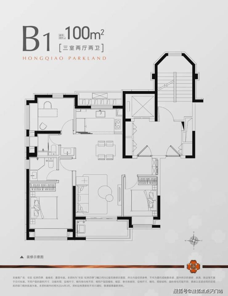 建面约100㎡户型是“明星”户型,无过道面积的浪费,空间尺度感阔绰。