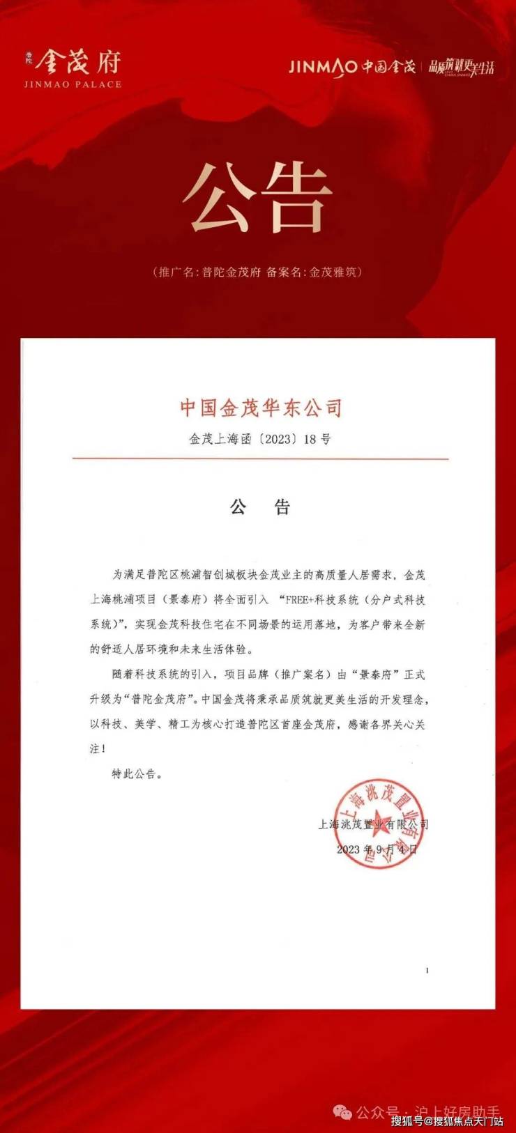 2023年9月4日,中国金茂华东公司发布一则公告:金茂上海桃浦项目(景泰府)更名为普陀金茂府。