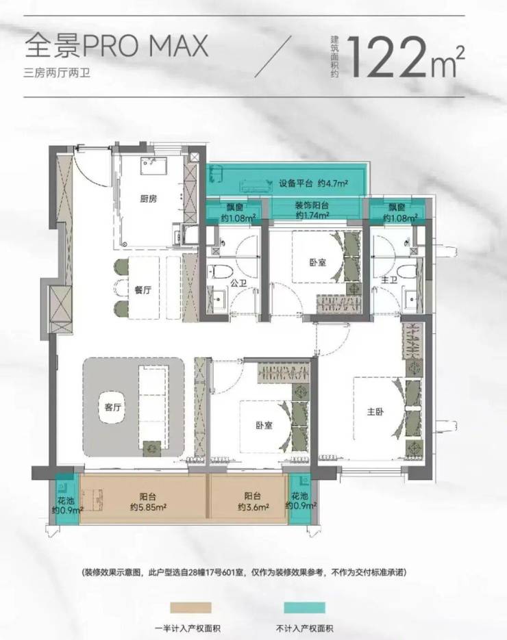 以105㎡的户型为例,“三阳台”搭配花池的设计,直接性价比拉满,按照规定:阳台计一半面积,花池不计面积,加上主卧+卫生间还带飘窗(主卧飘窗非承重结构),如此算下来,对购房者而言,日常可以实打实利用到的面积是远超市面上其他三房产品。