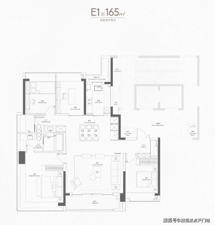 188户型2梯2户,有独立的电梯厅。4房3卫设计,还是3明卫,这两点还是不错的。