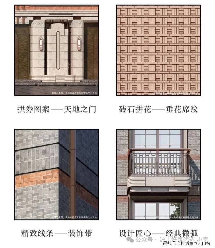 在建筑风格上,项目运用了4大新精致图案,从 拱券图案、砖石拼花再到引入了文艺复兴建筑经典手法——刻槽技术,打造建筑装饰带, 运用石库门椭圆造型元素,打造前沿建筑符号!
