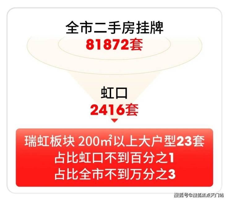 据链家网最新数据显示,全市二手房挂牌81872套,虹口2416套,瑞虹板块200㎡以上大户型只有23套,占比虹口不到百分之1,占比全市不到万分之3!