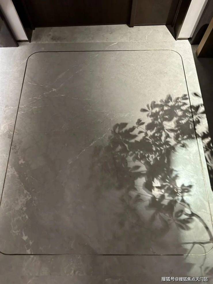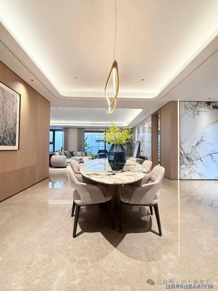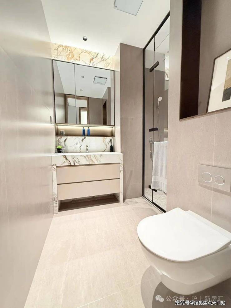 这个是入户玄关处的地面,大理石地面搭配金属线条勾勒出玄关地界,归家的氛围感从这个区域就开始了~这还不是重点,玄关座椅背后,是一面皮革包裹的墙面。鞋柜下方做了悬浮处理,同样也是内嵌灯带,这里灯光的角度还会再调整,因为灯光映射在大理石地面上,要显得尽量柔和不刺眼;同时,鞋柜下方可放拖鞋,还能放扫地机器人,便于日常清扫打理。鞋柜的饰面,纹路方向统一,呈现出极强的协调感。橱柜作为强功能性的收纳系统,自然少不了操作性能上的考究,吊柜做了升降式的拉篮,以后再也不用爬上高凳拿取了。下方的橱柜则做了转角拉篮,充分利用转角空间,使物品井然有序的同时,轻松方便取放。水槽也是一个大单槽,放得下炒锅汤锅这种大物件~抽拉式龙头,清洗大水槽的时候很方便,360度旋转伸展自如,这款弯管还是硅胶材质,柔软耐用有弹性,还可切换出水模式,出来的水柱也是很柔和细腻不飞溅。厨房玻璃门是上轨道移门,意味着地面部分没有任何轨道,不会有灰尘积攒,炒菜时关上,避免油烟散入室内;平时拉开,可以扩充室内视觉感受。卫浴缦云上海所有户型的所有卫生间里都用了悬浮式的洁具和柜体,确保了下方空间的打扫无死角,对未来的入住带来非常大的便利性!吉博力同层排水技术,静音是最大亮点;特制“水母”地漏,多重防臭防反溢。干净舒适的卫生间,是从空气到水流的全面把控~你们可以看下缦云上海是如何处理卫生间木门的防潮的——卫生间一侧用大理石做踢脚线,这是真正细致入微的巧思!主卧卫生间配备的电热毛巾架简直就是遇到潮冷节气的“福音”,让毛巾、内衣都能够提前加热干燥。层高 对于缦云上海的纯大宅社区定位,能买这样产品的购房者会非常在意空间感。缦云上海全部户型层高约3.3米,室内所有空间的门都做了通顶设计,更阔绰的居室空间,将生活格局有效放大,通风、采光和观景体验的全方位提升!弧形元素缦云上海样板间里随处可见柔和的圆弧修饰,特别是柜体、墙体包边的圆弧转角,在进出各个空间时,减少磕碰的风险,对于有孩子和老人的家庭来说,是非常实用的友好设计。而且,门套做了弧形设计后,还叠加了金属线与墙纸做了分割,加强隔断界限感,提升室内家居精致度~比起中规中矩的直线,弧形施工工艺更复杂、造价更高,却多了几分灵动轻盈!这种弧形的元素不只是在样板间里,在售楼处也能经常看到,比如电梯厅。