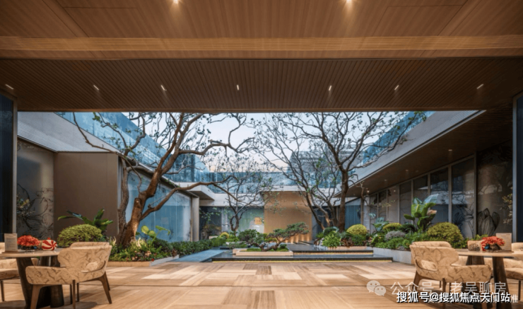 北入口社区大堂、下沉会所、下沉庭院与部分楼首层架空设计联合打造出社区共享客厅,以折型风雨廊围合庭院空间,为业主营造出温馨舒适的交流场所。