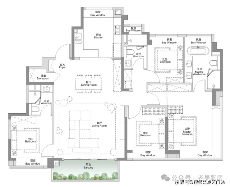 该户型做到了三开间朝南+4个飘窗+双面阳台系统+主卧套房设计+270°转角飘窗,该户型的居住体验、舒适度、尺度感,是同级别产品所无法比拟的。