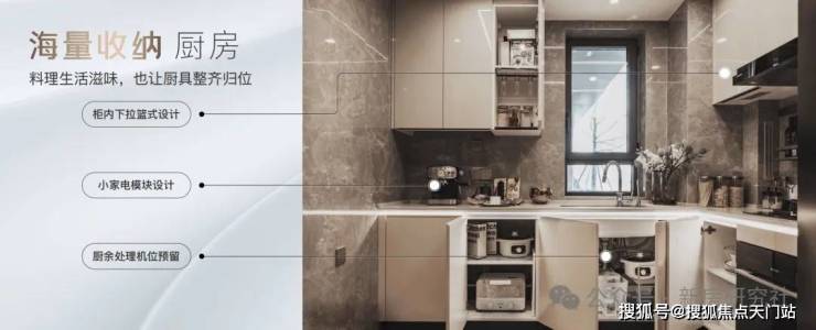 橱柜收纳系统:特别预置洗碗机点位、柜内下拉篮式设计、不锈钢挡油板、柜下操作灯、烹饪全流程功能动线一体化设计;