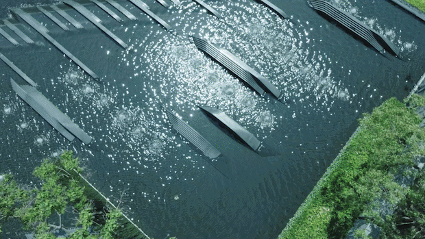 并通过跌水、涌泉和镜面水景等水景组合,使整个项目空间更灵动,也与黄浦江形成内外呼应。