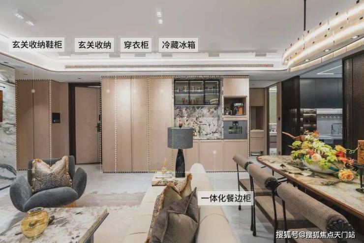 还交付一体化餐边柜(全部用木饰面包裹),咖啡机、各类厨电及酒柜都能在这里找到合适的位置。