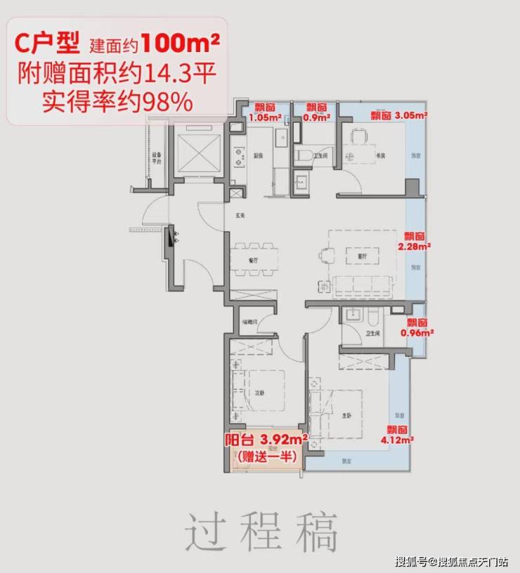 常规百平米户型仅3-4个飘窗,总赠送约6-7平;
