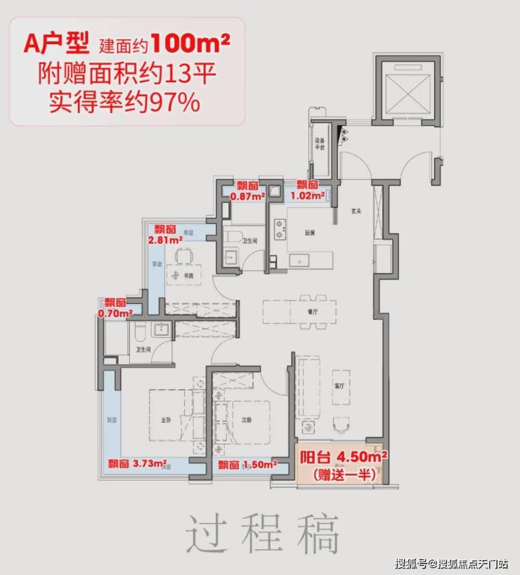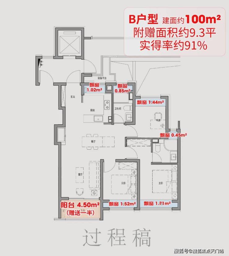 项目全系户型标配“全屋飘窗(全赠送)+大阳台(半赠送)”,经专业测算,百平米中间套实得率约91%,边套更甚,远超市场常规水平: