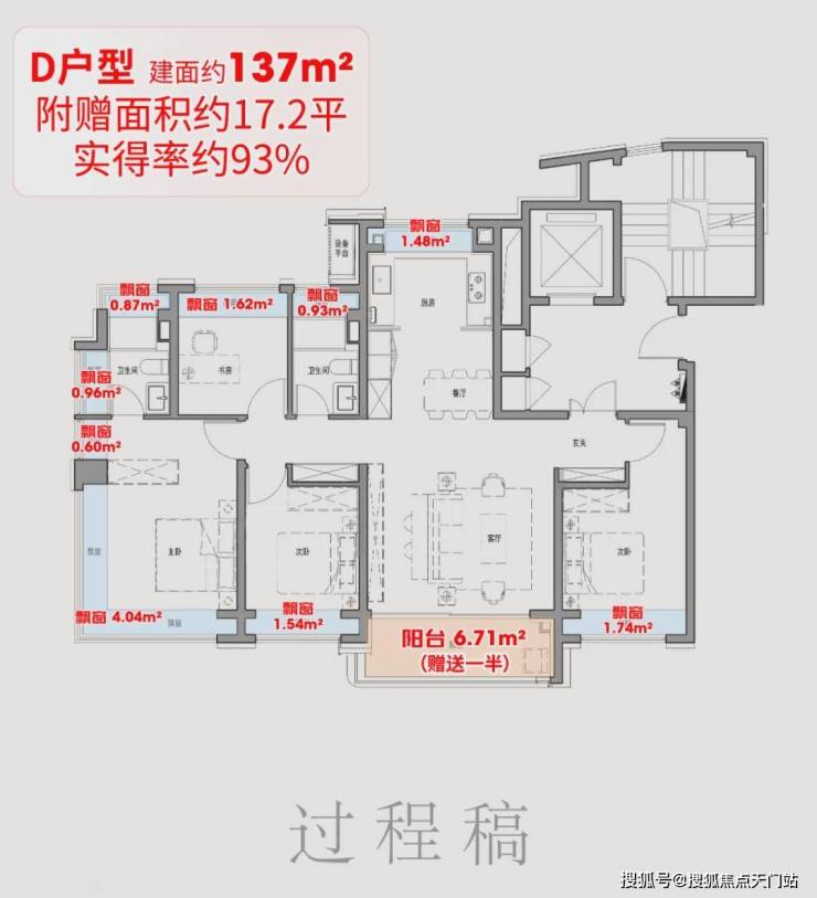D户型7飘窗,总赠送面积约17.2平,实得率约93%;