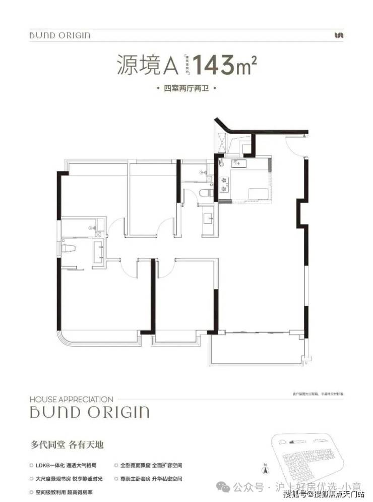 A户型是4房2厅2卫格局, 三开间朝南+LDKB一体化+全卧室带飘窗+主卧套房设计+动静分离,居住功能性更强。