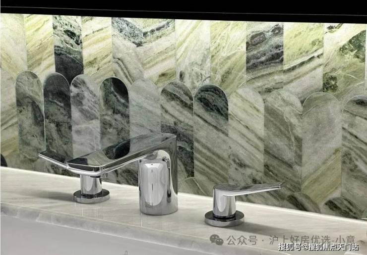 基础硬件都不差,项目在审美上还做了不少创新——卫生间大量采用奢石和石材,比如主卫柜体墙面就是香格里拉翡翠拼花,龙头是冷热分离式,成本更高: