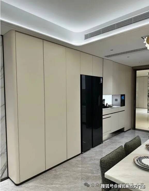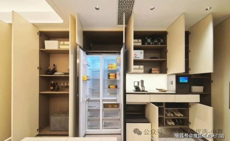 看到约143平户型,厨房岛台和上柜都不稀奇,厨房外的半开放式餐边柜和利勃海尔内嵌式同样也作为交付标准附赠,柜体额外提供接近1立方面积的收纳空间: