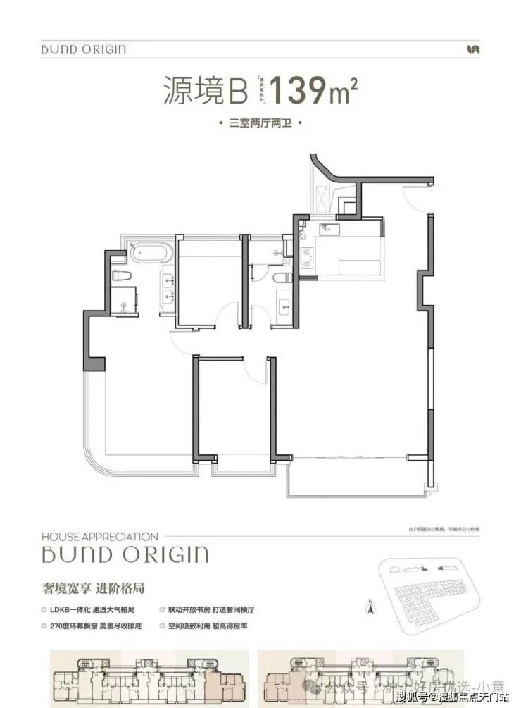 B户型是3房2厅2卫格局, 三开间朝南+LDKB一体化+奢阔宽厅+全卧室带飘窗+主卧套房设计+动静分离+主卧270度飘窗,舒适度更高。