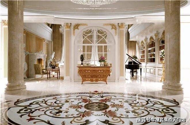 入户门厅比普通豪宅的客厅还要大,客厅的 两根罗马立柱 让这个空间满满都是仪式感。