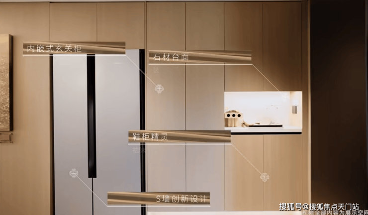 入户后,第一眼就可以看到玄关柜采用石材台面,下至标配鞋柜精灵,在S墙创新设计后,首批次房源更是额外赠送西门子双开门冰箱,这在以往可是上海千万级新房的交付标准: