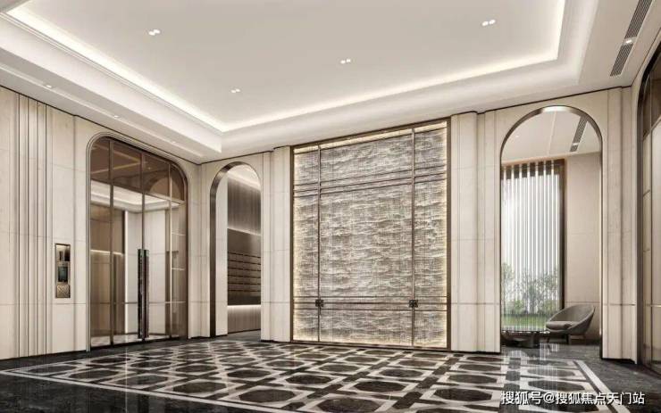 N+奢石铺装,从地面到公区,地下三层入户大堂荟萃普拉达绿石材、温哥华海石材、东方白石材、莫奈灰石材,特殊玻璃等,大手笔低营造调奢华的空间气场。