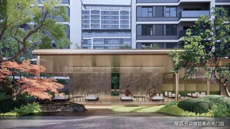以多种名贵植物的阵列形式,打造星级酒店式入户门仪,同时高层及洋房单元入口更设有约0.9m的高景墙,沉稳质感,营造摩登奢雅的尊崇体验。