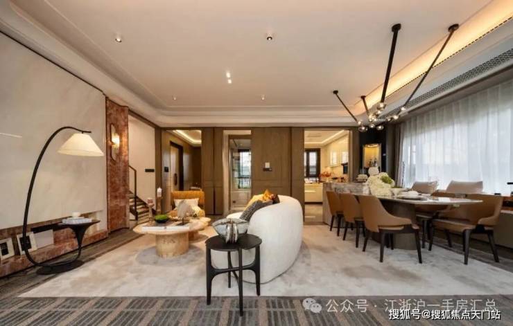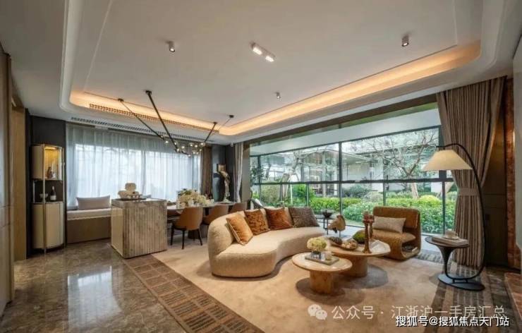 首层的餐客厅+9.8米跑道阳台的尺度感极强,形成超尺度“洄游聚厅”,客餐厅东侧超大全明飘窗,呈现约270°景观视野,将景观视野与室内尺度感提升至全新高度。