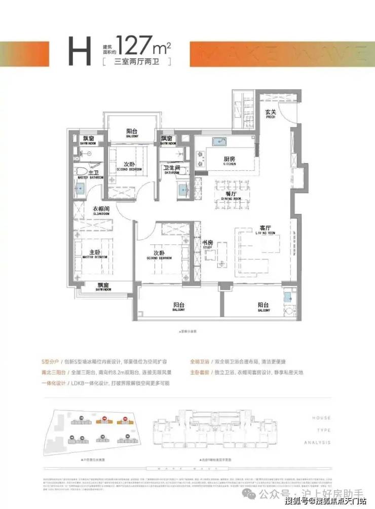建面约127㎡三房两厅两卫,该户型最大的亮点是有着比肩豪宅的南北三阳台黄金布局,这是2025年之后,松江首个三阳台户型。
