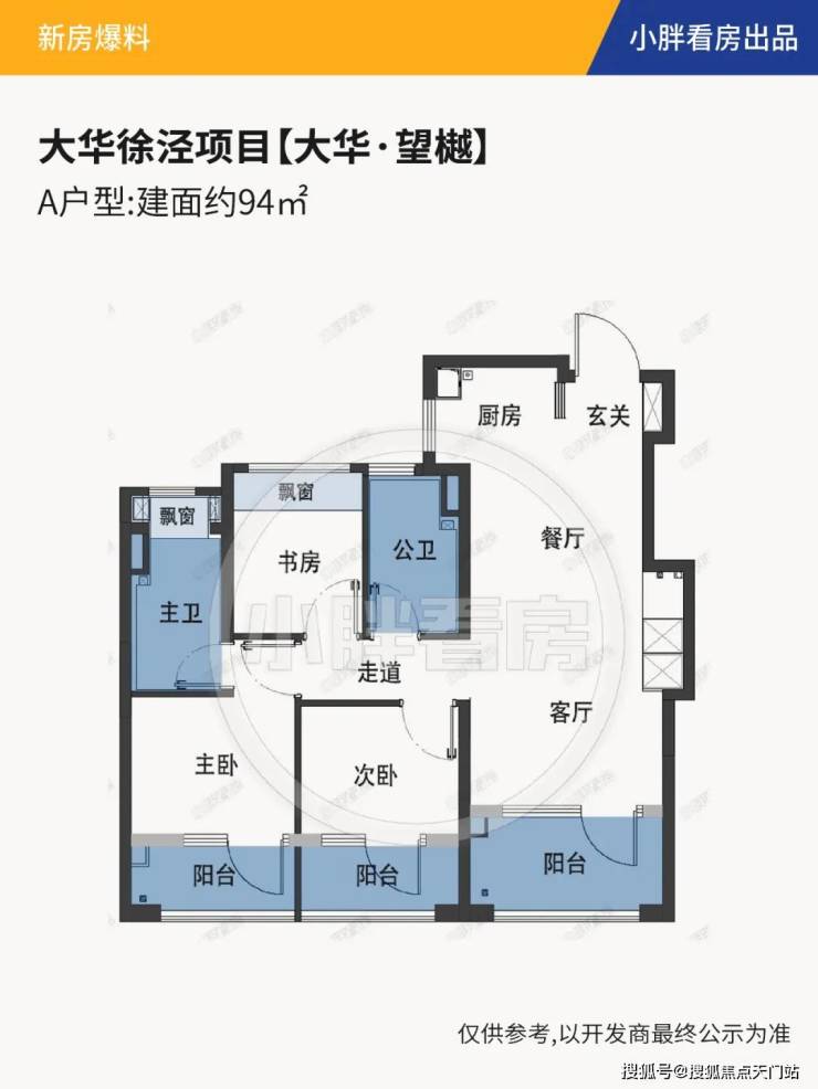 大华望樾的高层建面约94㎡户型做到了三阳台的配置;