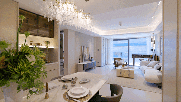 南向约9.3米超大面宽,搭配约3.3米的朗阔层高 , 营造出恢宏通透的空间尺度感。客厅与南向阳台完全打通,延伸出一片融于自然的阳光厅堂,推窗即见私家庭院,实现室内外场景的自由切换,演绎真正的墅居生活意境。
