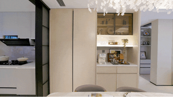 多功能水槽龙头 轻松切换用水模式, 滨特尔前置过滤器+末端直饮水+中央净软水机 ,全屋净水呵护家人饮水健康,还有 线形凉霸 默默为烹饪者送来清凉。所有展示橱柜皆为交付标准,包括 上柜、下柜、拉篮、随心抽,以及特别定制的飘窗水槽与水槽柜 ——每一处细节,都为真实的生活而考虑。