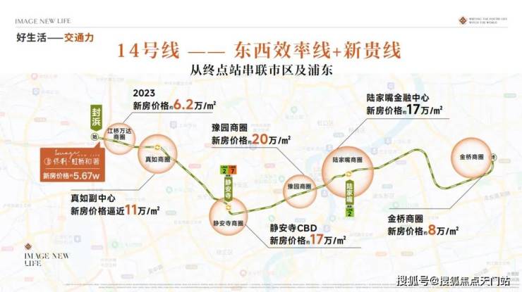 14号线和嘉闵线(在建中)双轨交汇,3站虹桥枢纽,5站普陀,一脉静安。距14号线地铁口仅约200米,步行2分钟即达。作为始发站,通勤有位,30分钟直达静安寺,45分钟抵达陆家嘴。同时相较沿线动辄10万+的房价,本项目“5”字头单价,堪称“外环外的预算,中环级的享受”。