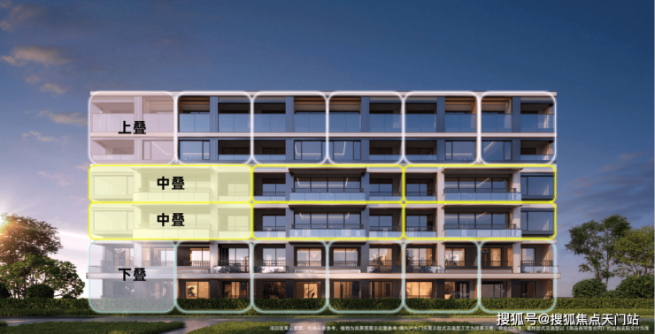 而中叠(建面约123㎡)则集便利与尺度于一身:不仅配备独立电梯厅,更以约13.4米南向面宽、约6米宽厅及南北双270°转角飘窗,营造出宽幕视野与通透空间,体感媲美整层大平层,实得率几近“满格”。