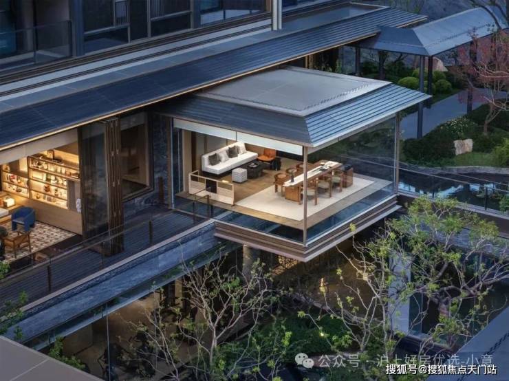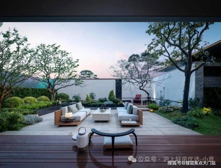 庭院的选材也极具讲究: 太行山金景石堆叠成小山丘, 岭南古桩铁冬青与 中华原生乌桕树移栽而来,蕴含 “聚财守业”的美好寓意。 细节之处,经得起推敲,让人越看越有味道。
