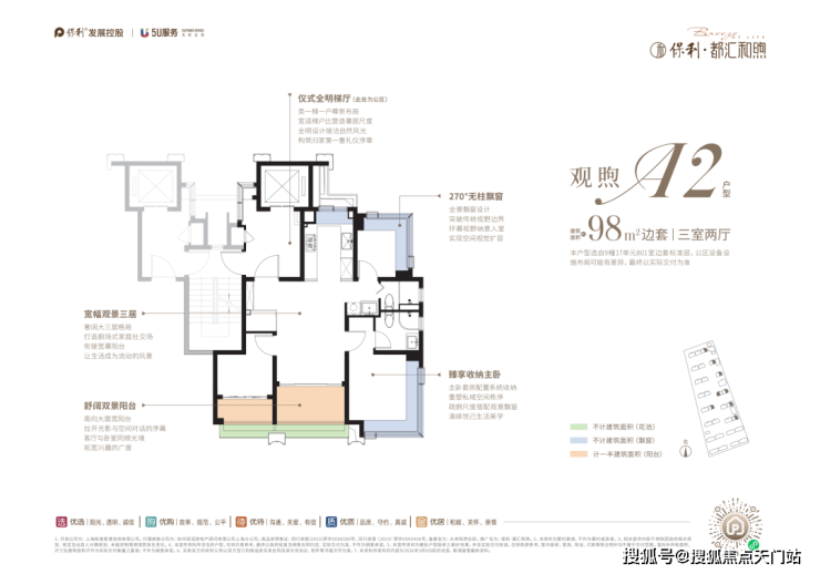 约98㎡3房:类一梯一户、全屋飘窗为标配,双阳台+花池是核心亮点(市面双阳台户型起步多为约110㎡),整体附赠约23㎡,是罕见的高实得率精致户型。