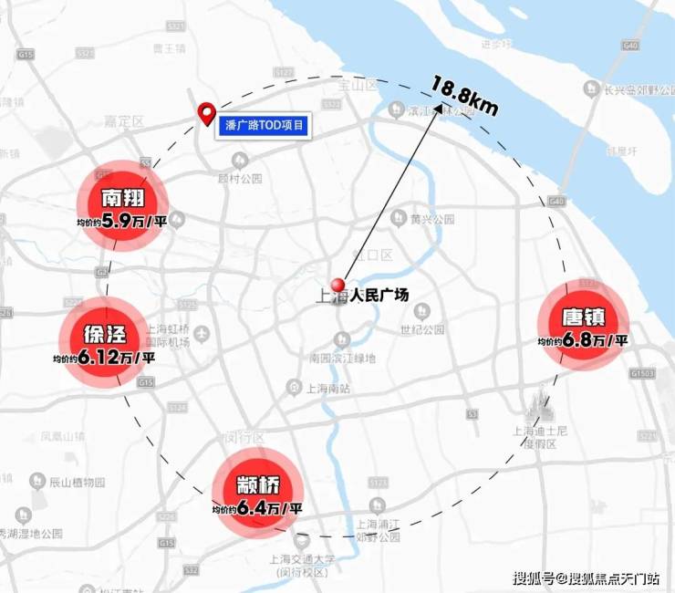 项目位于上海主城区,距离人民广场直线约18km,而以这个距离为半径画个圈,同纬度的是徐泾、南翔、颛桥以及唐镇。