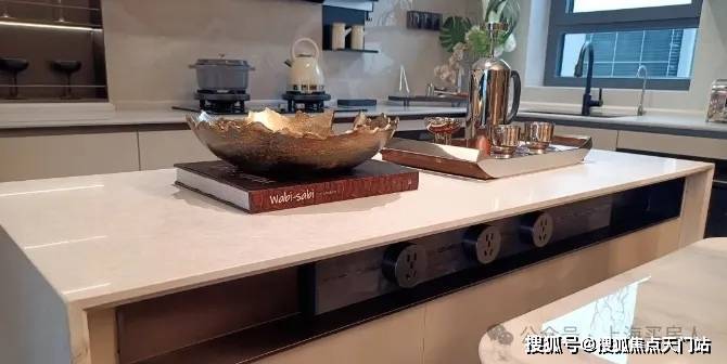厨房额外标配带 有收纳柜体的岛台空间,轨道式插座同样是交付标准,厨房台面是和内环某10万+项目同款材料: