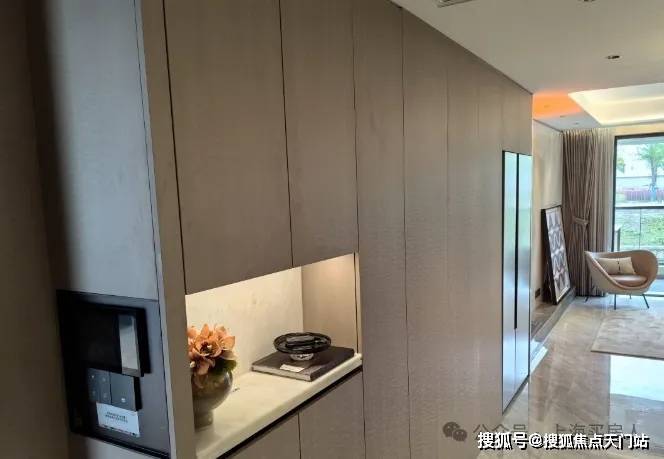 入户玄关处,包含冰箱上柜的整面木饰面都是交付标准, 首批次房源额外赠送西门子双开门冰箱更是亮眼配置,同价位新房从没有配备过冰箱作为交付标准;