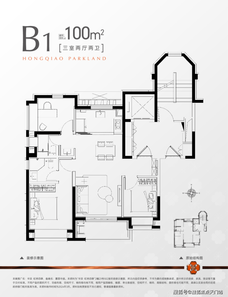 建面约100㎡三室两厅两卫的户型更适合成长型家庭。三开间朝南,LDK一体化以及双明卫的设计,造就全明户型,尽享阳光生活。玄关鞋柜精灵、美妆冰箱等人性化细节,处处尽显匠心诚意。北面次卧可做为多功能房间,书房、儿童房皆可,增加生活的延展性,满足个性化需求。