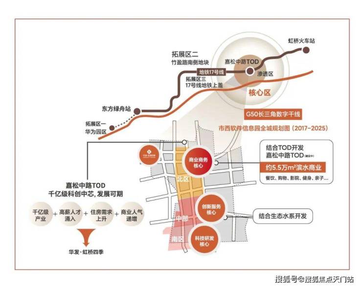 随着大虹桥科创功能西移发展的趋势,青 浦新城基于“一城两翼,一带三核”发展战略目标,通过17号地铁线串联起三大核心节点,东起徐泾北斗产业基地,西到金泽华为研发基地,中部核心就是赵巷市西软件信息园,未来这条产业带上预期将会有数十万人口导入。