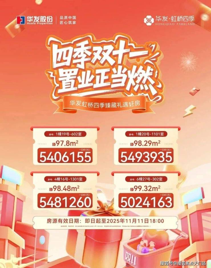 最新消息: 17号线嘉松中路地铁盘【华发虹桥四季】四期加推98套建面约98-100㎡3房;11月8日已过会均价56651元/㎡;往期少量建面约91-132㎡3-4房;悦惠双十一,总价450万起!售楼处线上火热预约中!