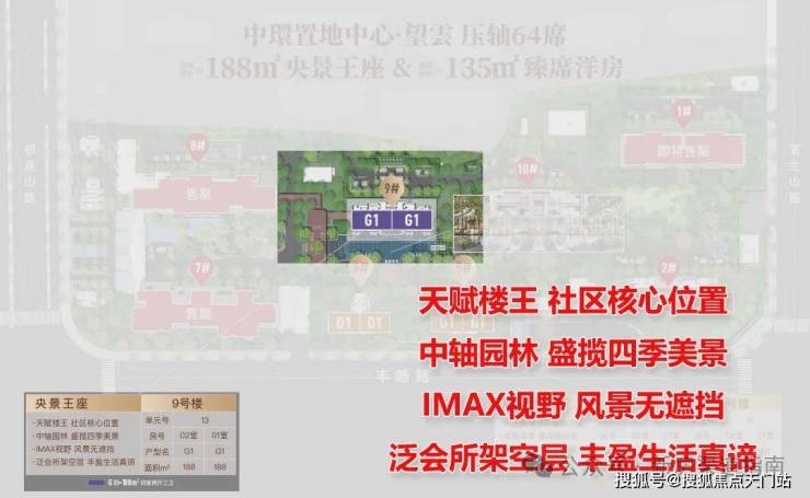 从楼栋位置来看,建面约188㎡大平层位于东地块正中央的 景观C位,前有近千平中央景观戏水池,楼下首层架空,堪称“楼王中的楼王”。