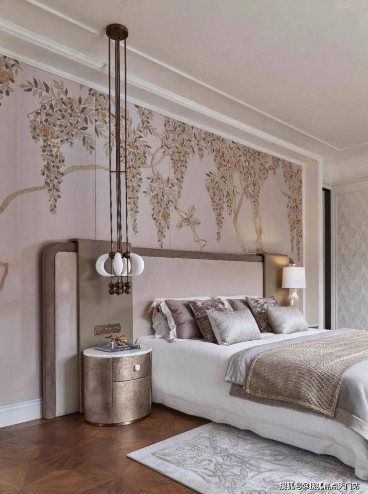 建筑面积约495㎡传家大宅,海派气质内外辉映;深色木饰面与柔和的刺绣主背景,框定空间层次格局,营造稳当厚重的氛围基调,法式留白的墙面与顶部造型,与原筑提取的典型拼花地砖相呼应,经典的精致与典雅,海派传家大宅的气度不言而明。