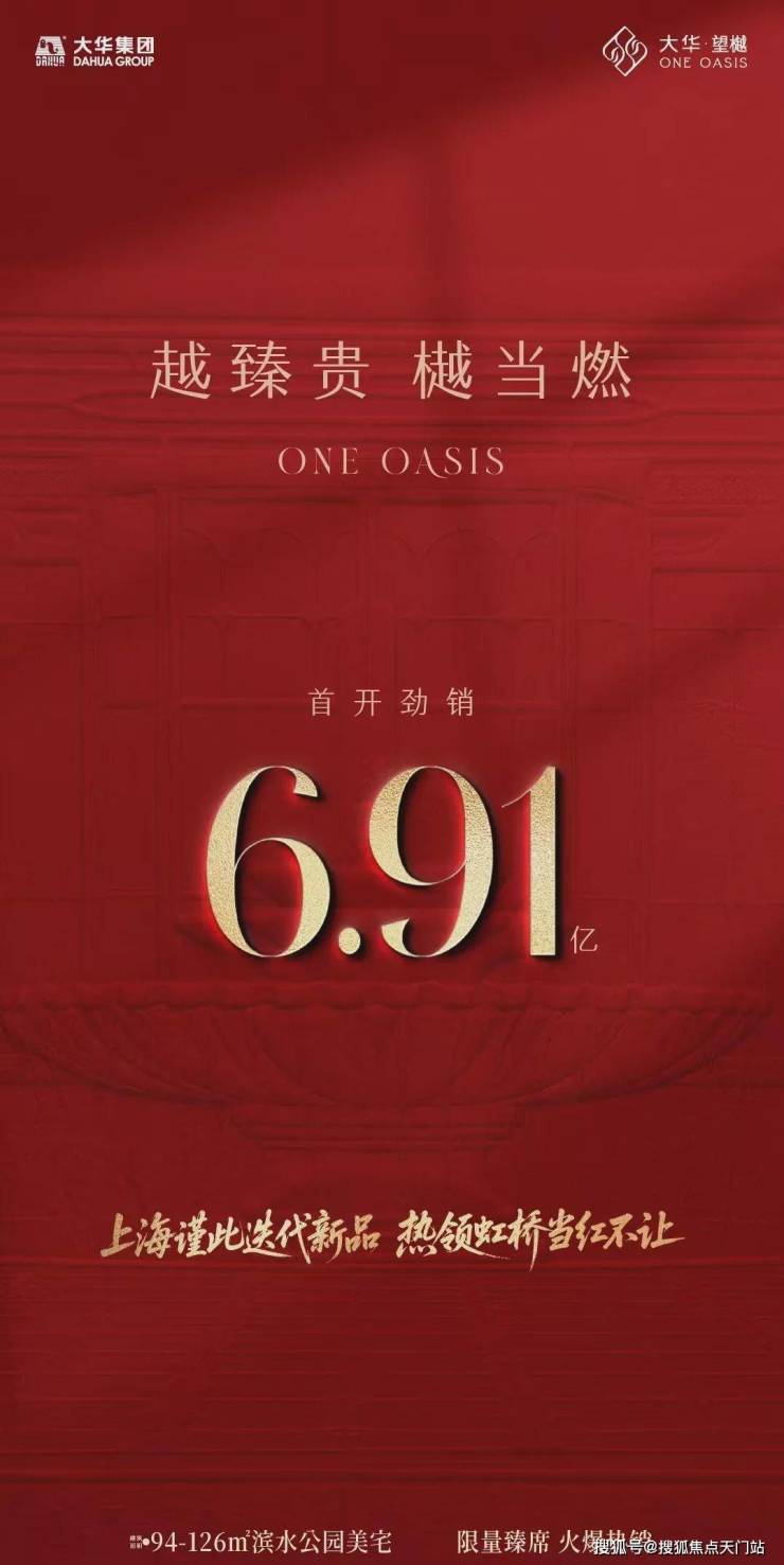1月25日,全上海聚焦大虹桥,由华集团匠心打造的徐泾封面作品---大华·望樾于万众瞩目下盛大首开。项目凭借自身优质的产品力与创新力,首批次建筑面积约94-126㎡滨水公园美宅,当日成交金额突破6.91亿元大关,强势领跑区域市场!